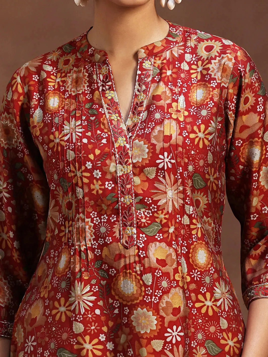 Red Printed Silk Blend A-Line Kurti