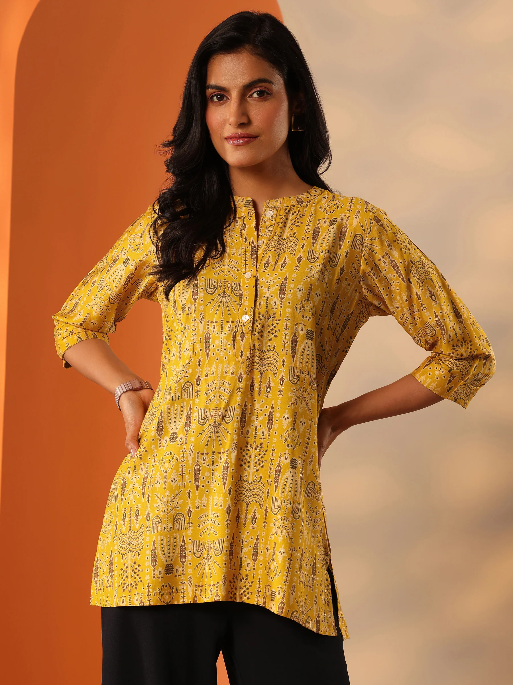 Yellow Printed Silk Blend Straight Short Kurti